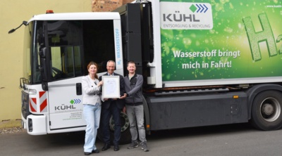 Bei der Urkundenübergabe in Heidenau (v.l.n.r.): Kühl-Geschäftsführerin Sylvia Bauknecht, Jörg Lacher, Geschäftsführer der bvse-Entsorgergemeinschaft und Verkehrsleiter Jens Angermann.
