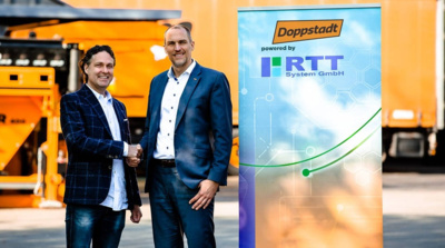 Bildunterschrift: Hendrik Beel (l.), Geschäftsführer der RTT System GmbH, und Dr. Philipp Nellessen, Geschäftsführer von Doppstadt, freuen sich über die erfolgreiche Zusammenarbeit beider Unternehmen.