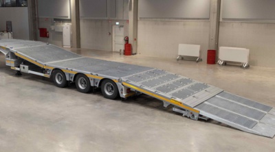 Der mit 9° geringe Auffahrwinkel der Flip-Tail-Rampe bietet gute Bedingungen, auch wenn die Bodenfreiheit eingeschränkt ist. Der vollflächige Gitterrostbelag trägt zusätzlich zu einer deutlichen Gewichtseinsparung bei und ist optimal für das Auf- und Abfahren von Maschinen mit Vollgummireifen. Zahlreiche Verzurrpunkte gewährleisten dabei eine sichere Fixierung der Maschinen während des Transports.
