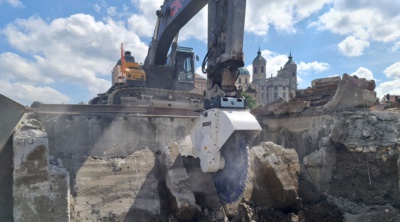 In der Innenstadt Weingarten in Baden-Württemberg beseitigte das Unternehmen CK Abbruch die Fundamente eines früheren Industriekomplexes, um Platz zu schaffen für ein neues Wohnquartier. Diese Arbeiten in innerstädtischer Lage waren vergabegemäß geräusch- und erschütterungsarm auszuführen. Die Abbruchexperten verwendeten hierfür zwei Bagger mit jeweils einer Kombination aus einem Schneidrad DMW 220 HD und einer Querschneidkopffräse der Baureihe KR.