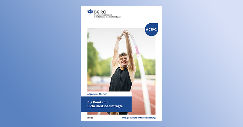 Das neue Merkblatt „Big Points für Sicherheitsbeauftragte“ (A 039-2) der BG RCI will auf unkonventionelle Weise Lust auf Arbeitsschutz machen. Eindrucksvolle Fotos, die Sportfotograf Lukas Schulze von Marcel Meyer (Deutscher Meister im Zehnkampf 2024) geschossen hat, humorvolle Zitate von berühmten Zehnkämpfern sowie nützliche Hinweise auf weitere Medien und ergänzende Seminare runden die Publikation ab.